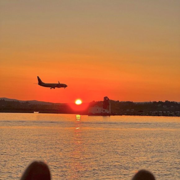 Last, we will stop in just the right place outside of Pontikonisi whilst admiring the descent of the golden red sun on the horizon and the landing of planes.