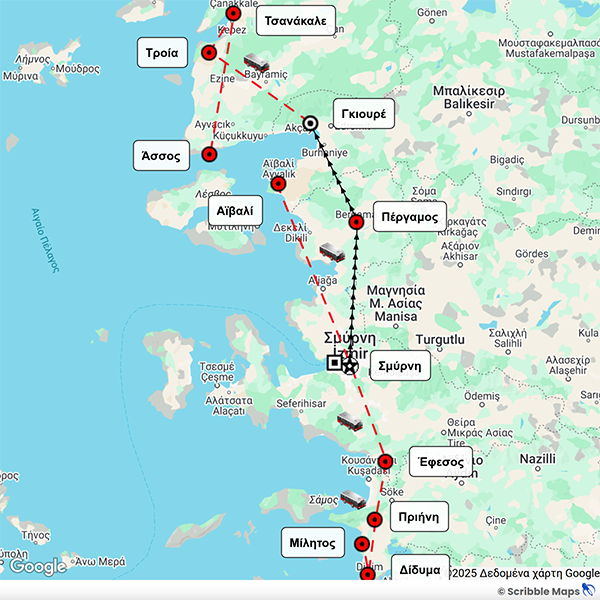 5 ημέρες αεροπορικώς σε Σμύρνη (Έφεσος, Πριήνη, Δίδυμα, Μίλητος), Πέργαμος, Γκιουρέ (Τροία – Τσανάκαλε/ στενά Δαρδανελλίων – Άσσος), Αϊβαλί (Κυδωνίες ). Διαμονή σε επιλεγμένα ξενοδοχεία 5* & 4*sup με ημιδιατροφή καθημερινά (πρωινό και δείπνο).
